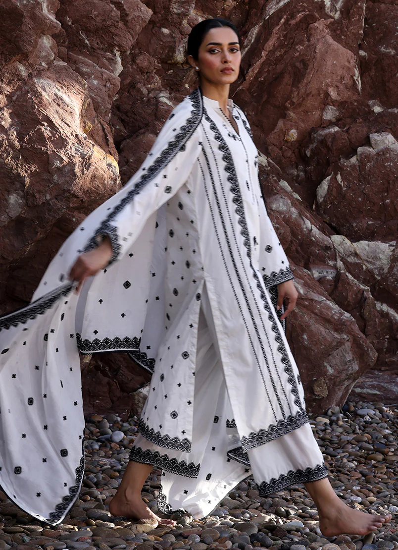 The White Cotton Embroidered 3 PC Suit from Spring Pret '25 collection features a band collar with lace embellishment, full-length sleeves paired with embroidered trousers & dupattas.