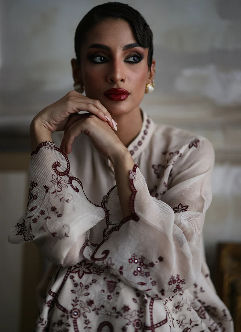 The Beige Karandi Organza embroidered kurta from our Tashkent collection which features a band collar and full-length sleeves