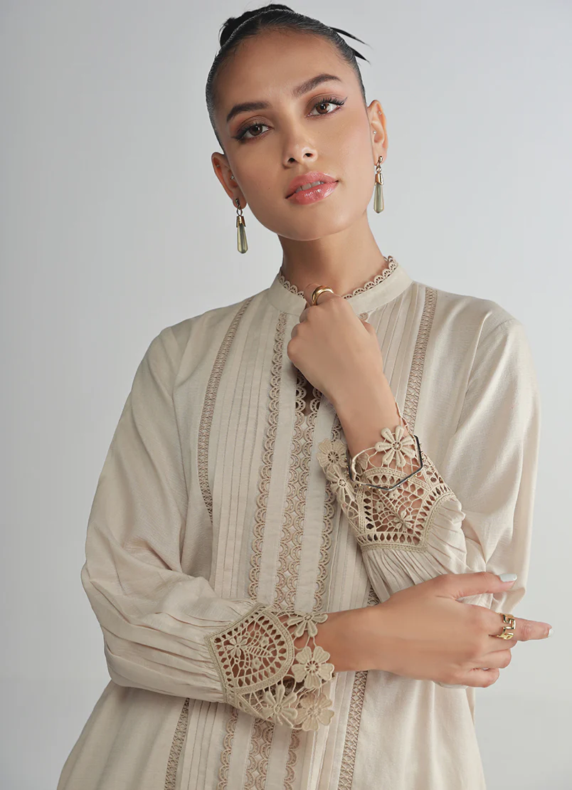 The Ivory Embroidered Co-Ord Set from our Autumn/Winter '24 Collection. A straight silhouette, round neckline with a slit, full-length sleeves, paired with a shalwar.