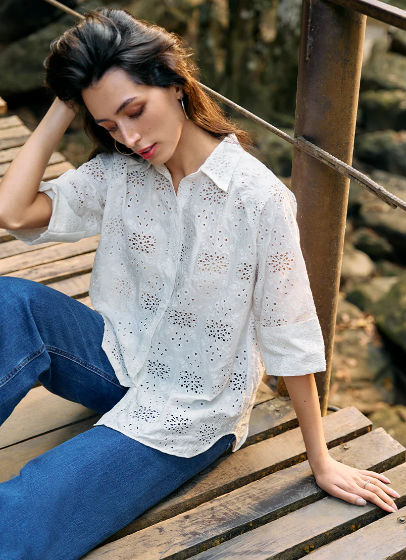 Button-down top featuring contemporary schiffli embroidery all over the shirt with three quarter sleeves.